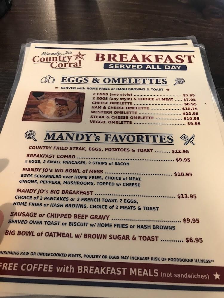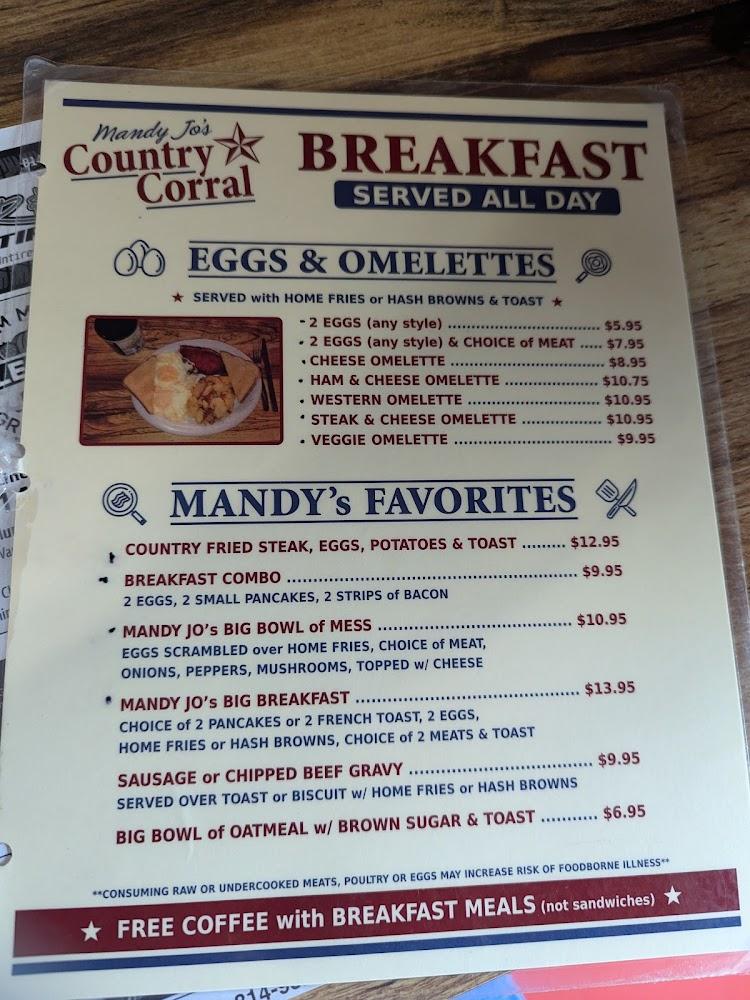 The menu at Mandy Jo's Country Corral boasts a delightful selection of traditional American food. Breakfast lovers can dive into a variety of egg dishes and comforting pancakes. For lunch and dinner, there are savory sandwiches, fresh salads, and hearty burgers.